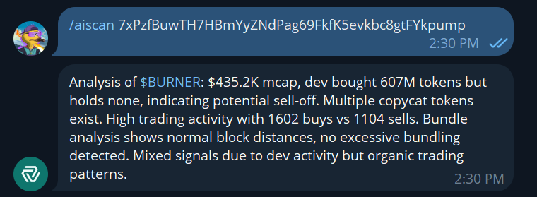 This command uses a custom AI model to analyze a token’s market data, dev wallet activity, and trading patterns to detect potential risks.