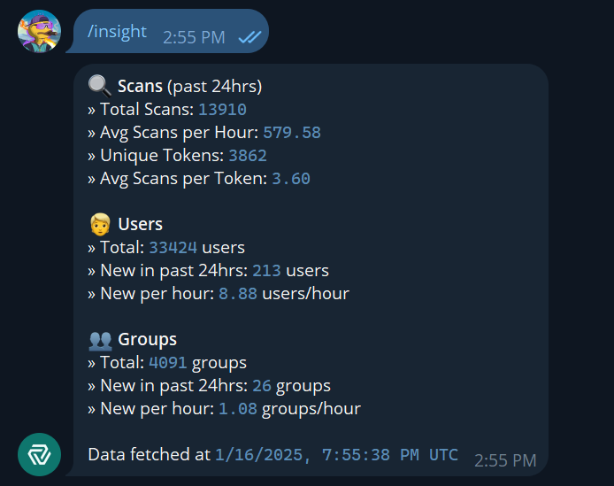 Token scanner analytics. Scans over last 24 hours. Total users. User growth and also insights into how many groups are using the token scanner.