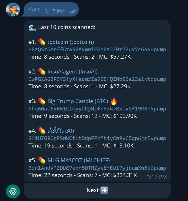 Shows the last tokens scanned. For example /last 100 will show the last 100 tokens scanned through the bot. By default /last will show the last 10 tokens scanned.