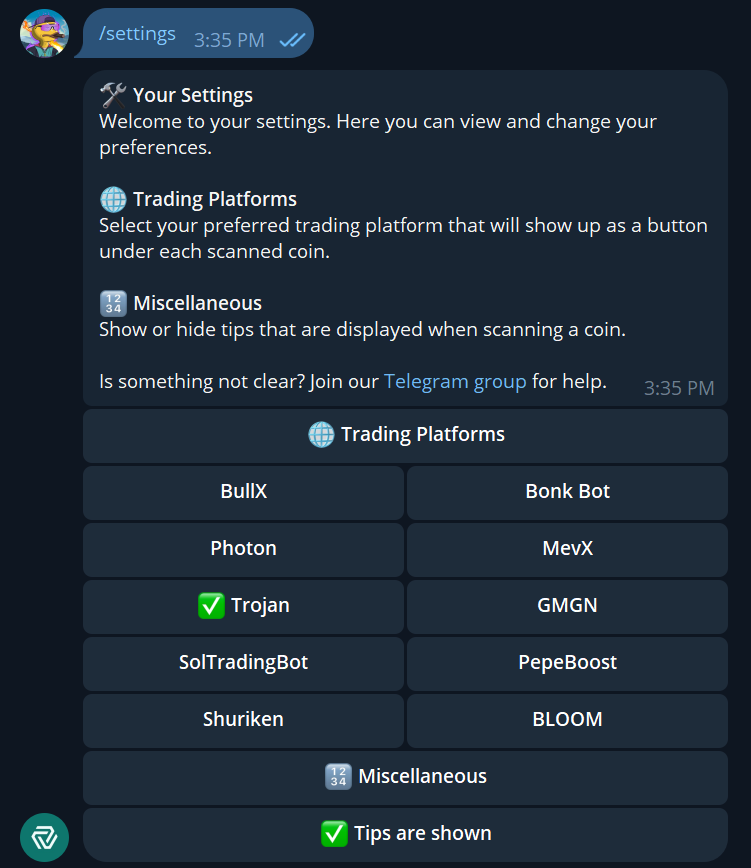 Select your preferred trading platform that will show up as a button under each scanned coin.